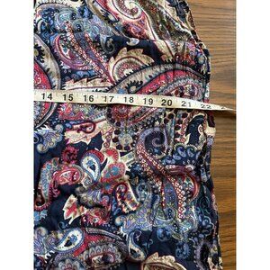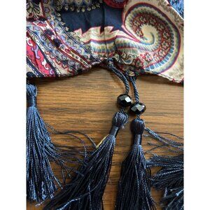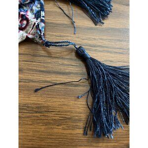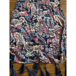 Blue pink white paisley scarf with tassels. Hand wash, lay flat to dry. Blue faceted beads on each tassel except one. Otherwise, good pre-owned condition.