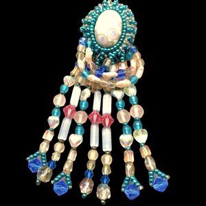 Beautiful hand beaded earrings by Sonoma jewelry artist Lisa Jo Silberkleit these earrings are made with vintage European glass cabs , framed by blue glass beads, The fesostrands have pink blue beads snd natural seed pearls, the dangling strands have pink blue beads with opalescent ab heart beads. Very sparkling, measures 4” x 1.5”. Please see all photos for full description,