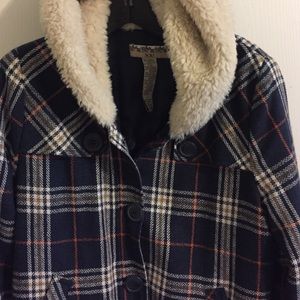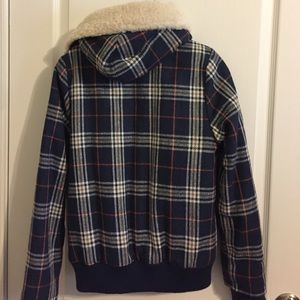 Blue plaid hooded quilted coat. Button down. Hood lined with faux shearling. Has pockets.