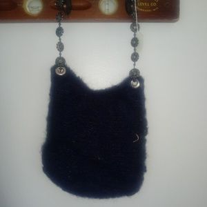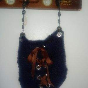 This blue wool purse is also embellished with a gorgeous beaded chain handle, and brown lace up front. this purse goes with everything, perfect for fall!