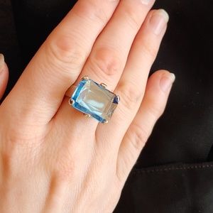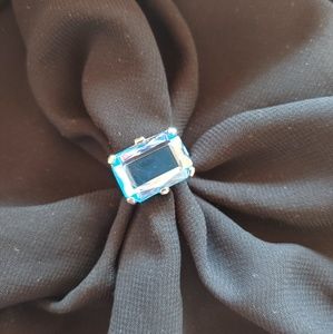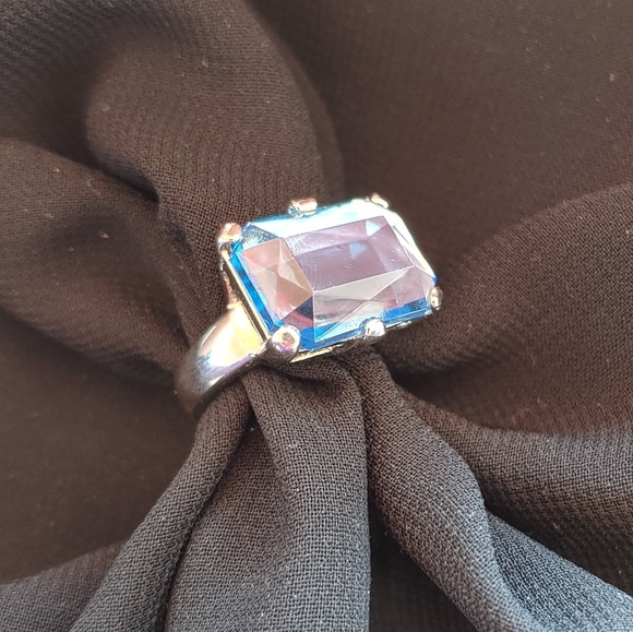 Silver colour costume jewelry ring with large blue rectangle stone. Approximate ring size 6 to 7 (please ask if you need diameter).