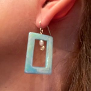 Blue rectangular, acrylic frame earrings with faux pearl.