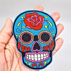 Blue red and pink sugar skulls iron on patch dia de los muertos diy wearable art