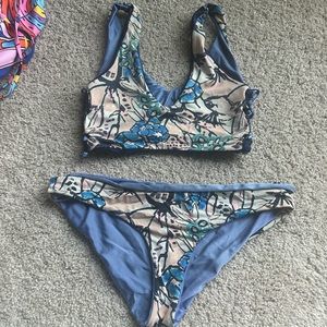 Blue with slight shimmer bikini and floral bikini! Some signs of wear and fading on floral side. I’m only getting rid of it because it’s too big on me now ):! Such a high quality swimsuit