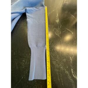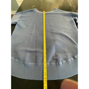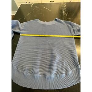 Blue ribbed sweater soft and slouchy athleisure Large. has thumb holes in wrist for extra comfort, rounded hem, great for pairing with leggings for that oversized sloughy look. beautiful blue hue can best be seen on close up of sleeves