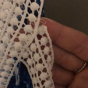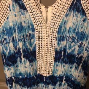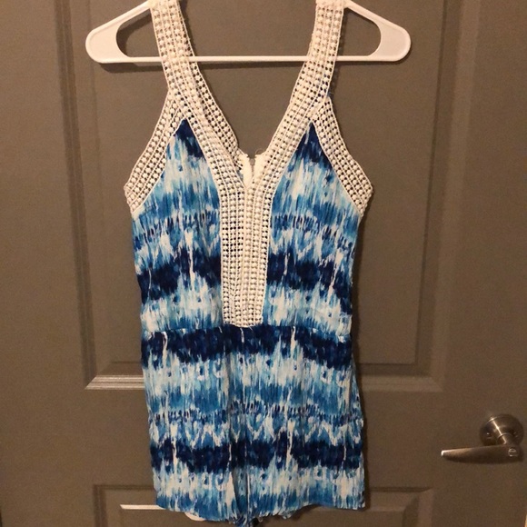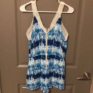 Super adorable blue romper with cute detailing down the front and on the straps. Zipper back closure. Some frays on the straps but overall very good condition