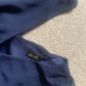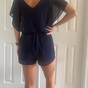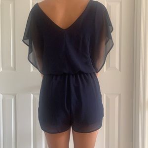 Blue romper. V neck, sheer with slip underneath. Pockets