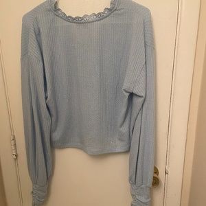 The baby blue textured fabric is light and flowy- perfect for warm weather. The v neck has floral trim of the same color. The sleeves are full length and because of the ruching can be pushed up easily. The fabric on the sleeves is loose fitting and flowy as well.