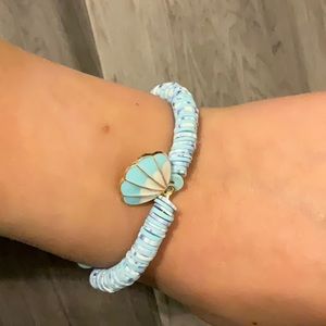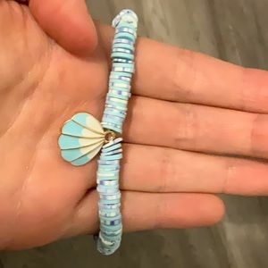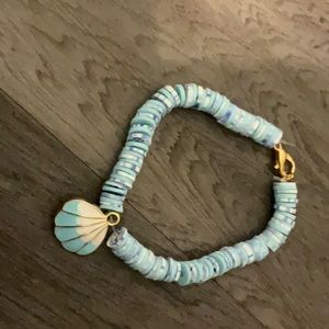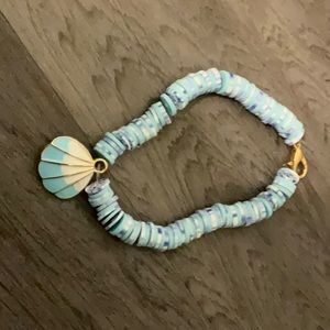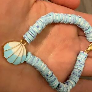 This is a mid blue with a white and blue mixed bead with a blue and white mixed charm. I recommend ages 6 and up