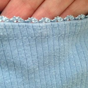 100% cotton. Little lace at neck (see picture) lace NOT itchy! Texture to shirt it is not a tee shirt! Small but roomy.
