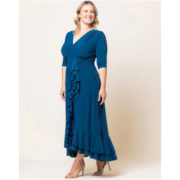 Very flattering heavy-weight jersey knit dress with side ruffle and tie. The style is a bit like a wrap dress. Very fun and a bit flirty. The "aegean blue" color is somewhat between a blue and a teal--unique and very pretty. 3/4-length sleeves.
