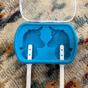 Joie blue silicone unicorn popsicle mold-makes 2. Comes with clear lid and 2 sticks that are removable for storage. Easy to clean. Item is in gently used good condition to like new condition.