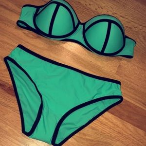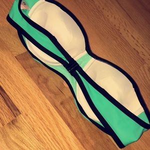 Medium light blue strapless push up top with black detailing with matching bottoms