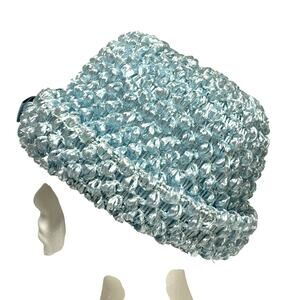 Vintage light blue straw hat with cute little bow at the front. This hat is a bowler style with upturned rim all around. No tags but there is a union label inside and the materials feel like a synthetic straw on stiff netting. Classic mid century church lady daytime chapeau is so cute! In overall good condition - some makeup stains on the front inner lining (see pics) but otherwise no damage or flaws.