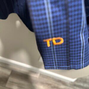 Features a sharp Blue and black stripe pattern with stylish contrast print inside the collar and cuffs, plus signature “TD” embroidery near the hem.