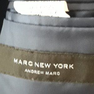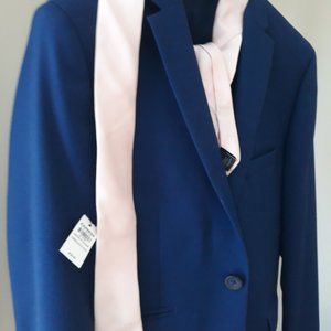 A blue suit, a tuxedo with pants, comes with a pink tie.