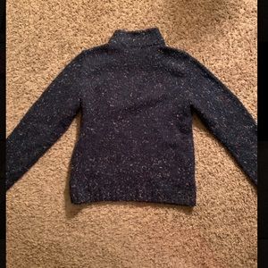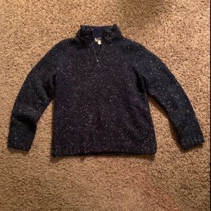 Blue sweater with dashes of all colors, small zip up and there is a collar