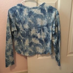 This long sleeve shirt is from Hollister. It is a blue tie dye shirt and has Hollister written in black on the sleeve.