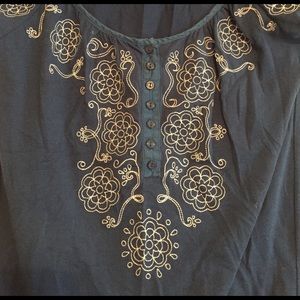 Blue top with white floral embroidery. Cinch bottom. Super comfy