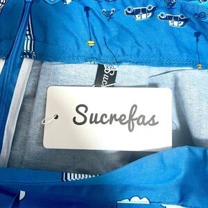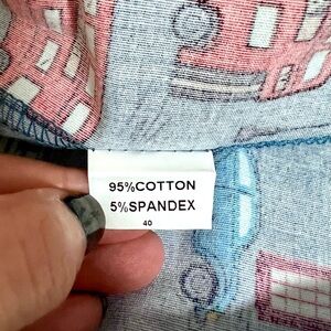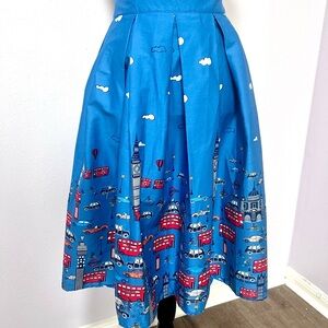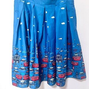 This vibrant blue midi skirt features a charming pleated A-line design, making it perfect for both casual and resort wear. The whimsical print, adorned with red double-decker London buses, adds a playful touch to your outfit. Its pleated style ensures a flattering fit, making it a versatile addition to your wardrobe. The skirt also has a side zipper closure for easy wear.