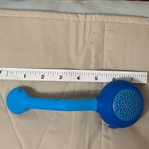 Two tone blue Polaroid P1 Bluetooth speaker. Does not come with charging cord, but that is easily replaceable, you probably already have one that will fit it. Has a magnetic strap to hang it. Portable audio speaker. Not a headset, one speaker. The light blue is like a hard plastic and the dark blue is kind of like a rubbery material. The circular end with a magnet connects to the back of the larger circle, that is the speaker. Buttons are on the side, for play, volume, pause, etc.