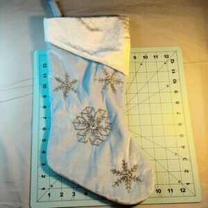 Add a festive touch to your holiday decor with this elegant light blue Christmas stocking. Features intricate beaded snowflake designs and a white cuff.