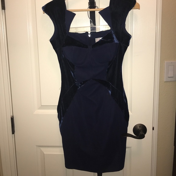 Blue bodycon dress with velvet detailing. Great for holiday parties