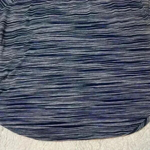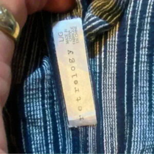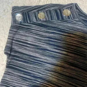Blue & white womens shirt with three mock buttons on each shoulder with capped sleeves. Has rounded bottom front & back. Would look great with white capris, shorts or pants. By Retrology. 67% polyester 32% rayon & 1% spandex. Size large SFPF HOME