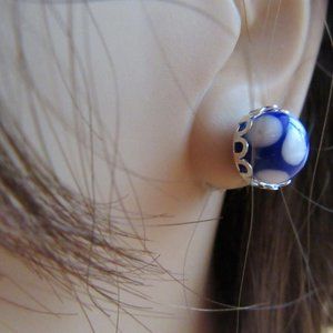 Blue & white glass vintage cabochon pierced stud earrings silver setting OOAK