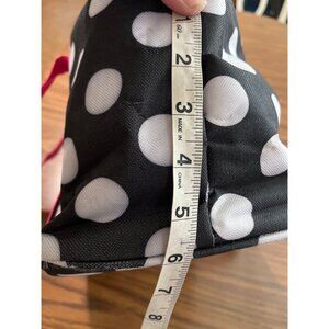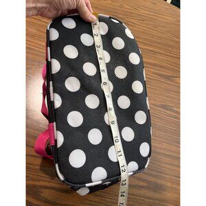 Blue white polka dotted bag with pink handles. Handles snap together. Bag snaps closed. Small snap pocket in front. Good sized bag. Good pre-owned condition.