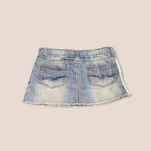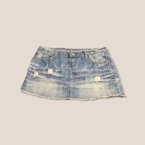 Skirt features a light wash denim material, distressed with a Raw Hem and a mini length.