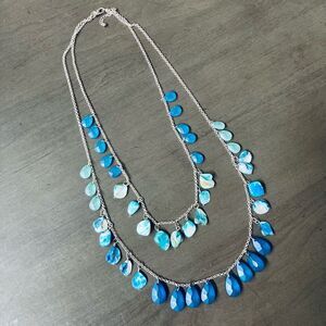 Blue Bead Sea Shell Double Strand Silver Chain Necklace