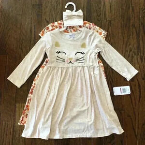 Details: Cutest set and perfect for all weather!! Dress #1 is a long-sleeved dress with cat face and ruffled skirt. Polyester/Spandex blend. Dress #2 is short-sleeved, ruffled skirt with bow at waist. Perfect to pair with a jean jacket and leggings!! Original MSRP $48!!