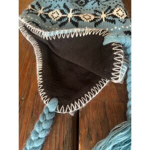Blue/Black/White Fleece Lined Winter Beanie w/Tassels sz OS (Unisex)