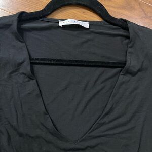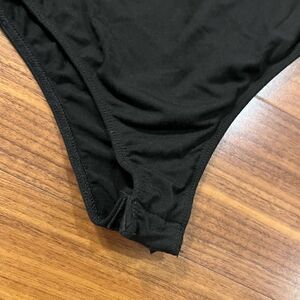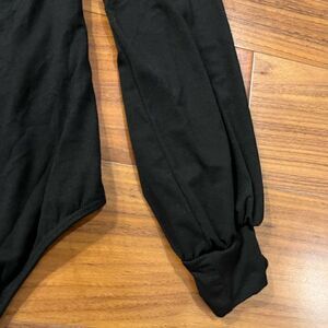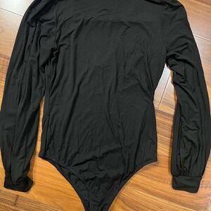 Blue Blush women’s black, bodysuit new without tag, has stretch, V-neck, long sleeve with a slightly ruched shoulder, cuffed sleeve, extremely soft, size large