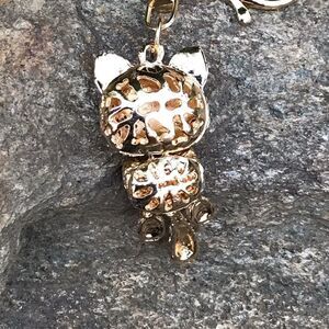 The whole keychain measures 4 1/2 inches long. Just the cat measures 2 inches long and 1 inch wide.