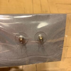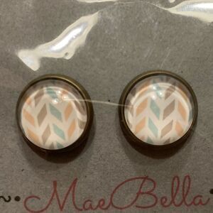 Bronze tone cabochon stud earrings with tan, blue, pale coral on cream background. Geometric chevron like pattern. Cute relatively neutral earrings for everyday wear. Color may vary with lighting or device. Photos are a part of the description.
