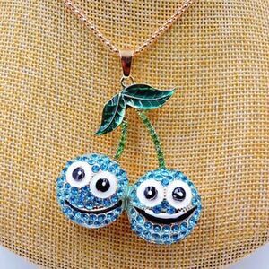 Blue Crystal Enamel Charm Cherry Pendant Sweater Chain Necklace NWOT