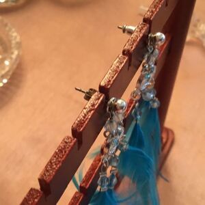 Silvertone earring with post and clutch backs.    They feature a pretty silvertone charm with thee blue crystals and blue feathers in an overall drop of 4”.  The crystal charm has a 1/2” width to give you an idea.  Very gently used as shown in photos.