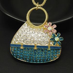 Blue Enamel Cute Basket Flower Crystal Pendant Chain Necklace NWOT