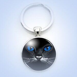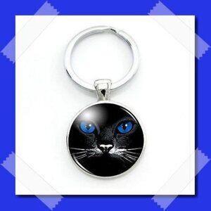 Blue-Eyed Black Cat Cabochon Glass Pendant Metal Key Ring