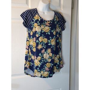 Adorable blue Floral Shirt. Great for casual wear or layering for professional or cooler weather. Pit to pit 18, length 24. 92 % polyester 8% spandex