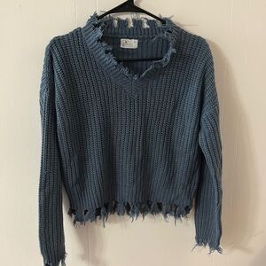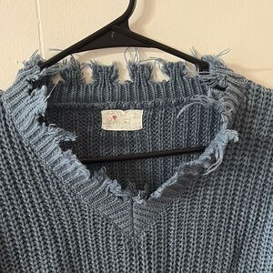 Stay stylish and cozy with this blue frayed V-neck sweater. Perfect for any casual outing.