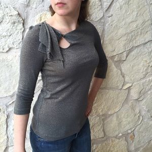 Beautiful top with an asymmetrical keyhole and ruffle in a blue-gray fabric with gold threads running horizontally. Others think the fabric looks green. The sheen on this is just gorgeous and very versatile. Excellent gently used condition, minimal fraying on the ends of the ruffle (which are meant to be unfinished). Offers welcome using the offer button!