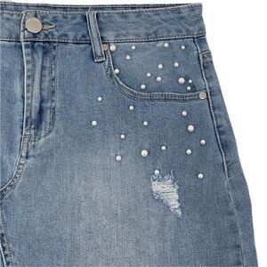 Blue Jean Denim Mini Skirt Pearl Beaded Distressed Raw Hem Juniors Size 9 CP