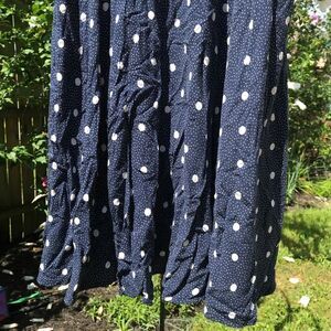 Blue with white polka dots midi sundress with adjustable straps and elastic across the back. It zippers closed on the left side.