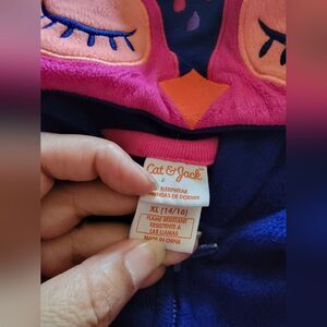 Cozy blue owl onesie with vibrant orange, pink, and purple accents. Features a cute owl face on the hood. size 14/16. good used condition. very soft and thick. Great for fall/winter or as a Halloween costume!