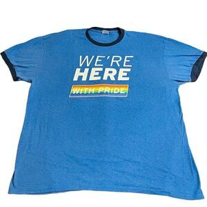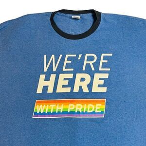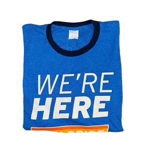 Blue ‘We’re Here with Pride T-shirt printed for Lambda Legal. In excellent condition
