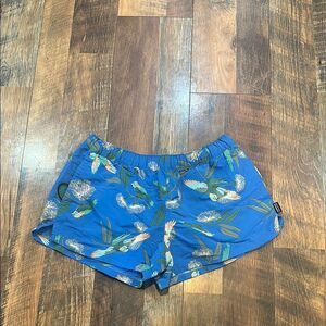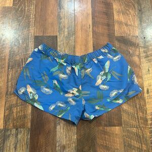 Vibrant blue shorts featuring a playful parrot print. Perfect for a casual day out. Elastic waist and quick dry material. The waist line does have an inner drawstring. The waist measures 14 inches across unstretched. The rise is 10 inches and the inseam is 2 inches.
