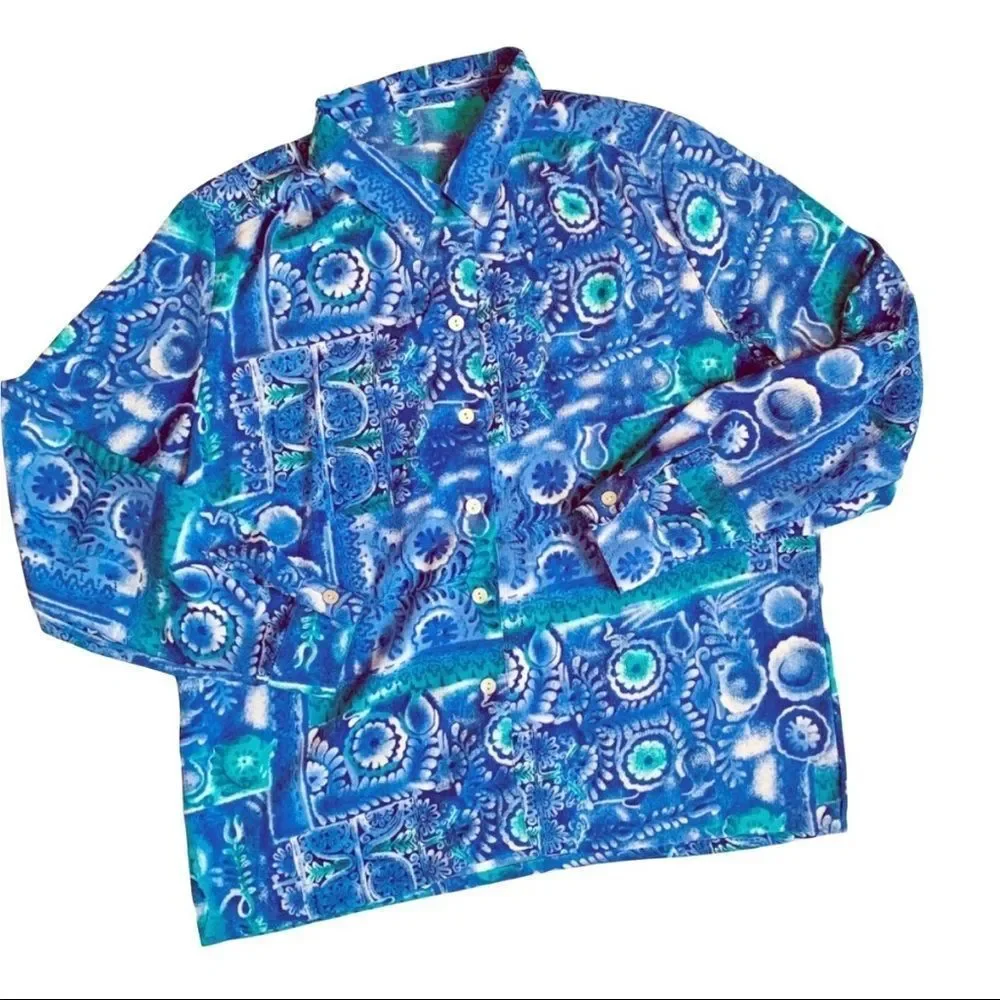 Blue pattern button down blouse. Long sleeve, white buttons, also on the cuffs. No tag, size Medium. Printed Button Down Long sleeved Blouse. Good condition.